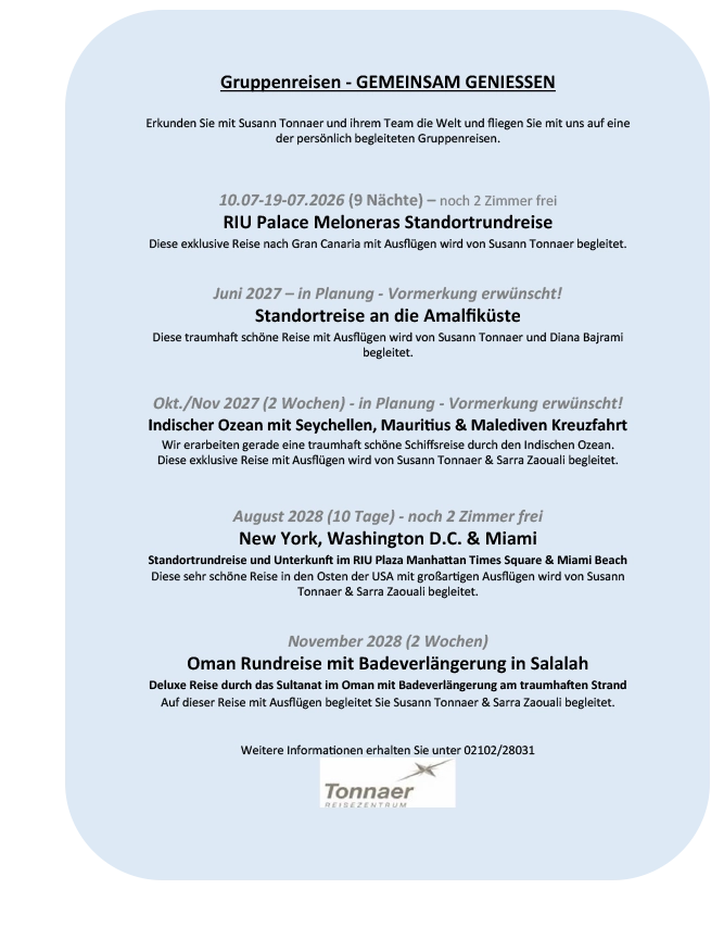 Wir stehen Ihnen gern mit unserem kompetenten Fachwissen für Ihre Urlaubsberatung zur Verfügung. Die zentrale Lage in der Ratinger Fußgängerzone, gegenüber der Peter und Paul Kirche, ist für eine persönliche Kontaktaufnahme leicht erreichbar. In unserem Haus finden Sie alles rund um Ihre Reiseplanung. In der Beratung zeigen wir Ihnen gern alle Möglichkeiten.